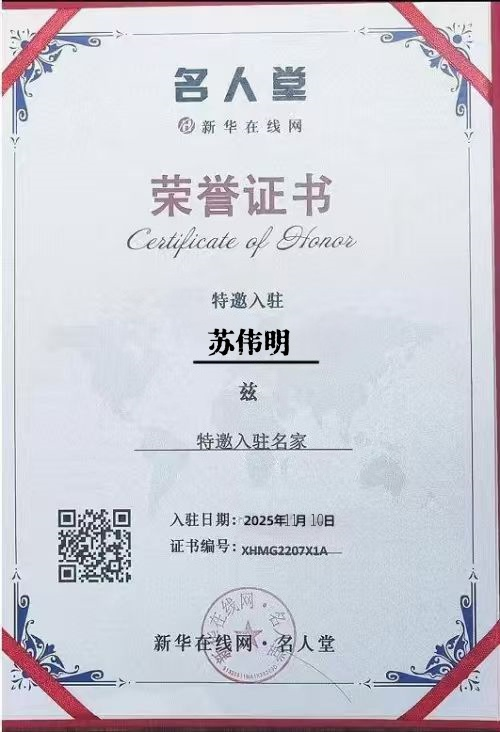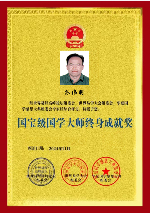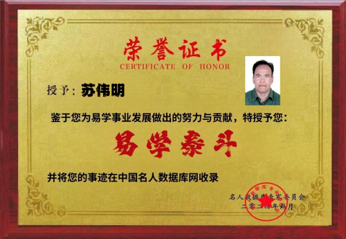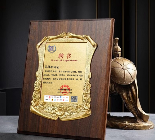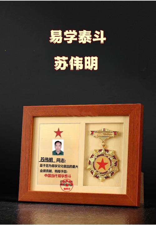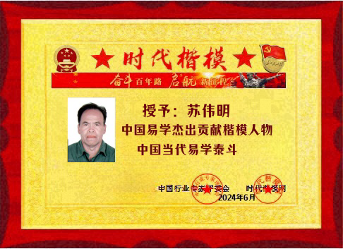 荣誉加身:以实力彰显行业标杆 深厚的造诣与突出的贡献,让苏伟明在易学领域赢得了广泛认可与诸多殊荣。2023 年,他被中国易学家协会授予 “德易双馨易学家” 称号,这一荣誉既是对他专业能力的肯定,更是对他品德修养的赞誉;2024 年 6 月,中国行业专家委员会又授予他 “易学杰出楷模贡献人物” 称号,彰显了他在易学传承与创新领域的行业影响力。