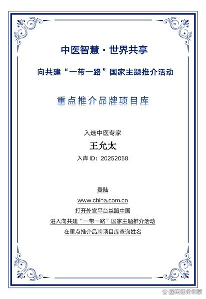 踏实笃行:以医者初心走向世界舞台 随着中医药“走出去”战略的不断推进,王允太的事迹和理念也逐渐引起国际同行的关注。在入选“一带一路”国家主题文化健康品牌推荐项目后,他所代表的不仅是一个医生的荣誉,更是一种文化的背书,一种文明的传递。他将继续秉持“人民健康为本”的信念,以仁心仁术为桥梁,推动中华医道在更广阔的平台上传播与落地。 对于未来,他始终充满信心与期待:“我愿意继续把中医的火种传递下去,让更多人了解中医、相信中医、受益于中医。我愿做那座灯塔,哪怕微弱,也能在某个角落为人点亮方向。” 从中原古地到岭南沃土,从山村赤脚医生到国家级推荐品牌人物,王允太用一生诠释了什么是“医者初心”。他以诚挚之心、精诚之技,不断探索、不断实践,在传统与现代、个体与时代之间,绘就出属于中医人的恢弘图景。 中医之道,薪火相传;大医之路,行稳致远。王允太正是这条路上不懈跋涉、默默奉献的守道者。他的故事,仍在继续;他的精神,值得敬仰。未来,伴随“一带一路”的东风,这位朴素而坚定的中医人,必将在世界文化舞台上发出更为动人的东方回响。 |